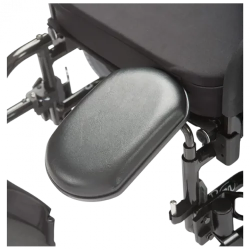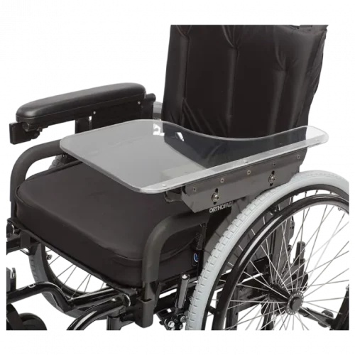Table amovible à glissière qui s’installe sur l’appui-bras pour permettre de prendre les repas ou d’effectuer toute autre activité en demeurant dans le fauteuil.